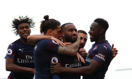 Lacazette celebrates with teammates after scoring against Fulham Alexandre Lacazette was left out of the French squad that won the World Cup...