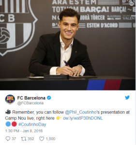“Coutinho has an injury in his right thigh. He will be out for 20 days,” Barcelona said in a statement, meaning he is likely to make his debut in the Catalan derby against Espanyol on February 4. NaijaBet.com